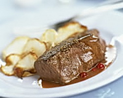 Mettez les pavés dans les assiettes, arrosez-les de jus de cuisson et parsemez-les d’airelles.