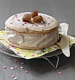 15 mn avant de servir, retirez le disque de meringue recouvert de glace du congélateur et disposez le deuxième disque par-dessus. Saupoudrez avec le reste de sucre glace en le tamisant à travers une passoire fine au-dessus du gâteau. Décorez avec les marrons glacés entiers et éventuellement quelques touches de crème chantilly.