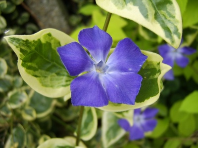 La concurence des racines en sous-bois fait que peut de plantes acceptent d'y pousser. Pour fleurir et éclairer cette zone ingrate du jardin, adoptez une pervenche panachée, Vinca minor 'Argenteovariegata'.