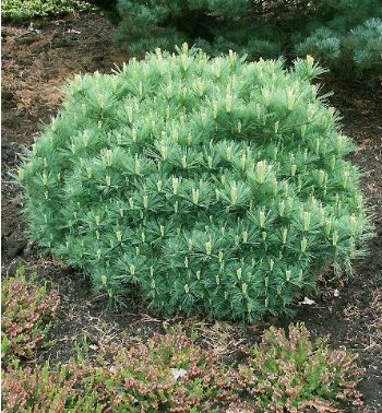 Le pin Weymouth ou pin du Lord (Pinus strobus) se caractérise par de longues aiguilles groupées par cinq. Il a produit quelqueq cultivars nains très plaisants pour les rocailles, tels que 'Nana', 'Minima' (H.60cm), et aussi à aiguilles bleutées comme 'Blue Shag' (H.1m) ou 'Radiata' (H.2m), aiguilles très douces. Installez-le dans des poches de terreau frais et bien drainé où il va s'étaler. Il résiste très bien au froid.