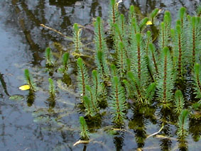 Vivace et rustique la pesse d'eau (Hippuris vulgaris) participe activement à la régénération des bassins, à l'ombre comme au soleil. Dans les zones peu profondes (50cm environ), cette plante aquatique laisse émerger des tiges non ramifiées qui peuvent atteindre 80cm. Avec ses nombreuses petites feuilles insérées sur la tige, on dirait un sapin de Noël flottant au-dessus de l'eau. Sa floraison est insignifiante.