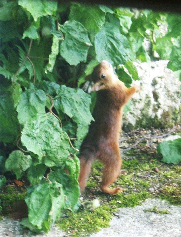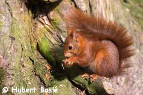 Alors que certains hibernent, de nombreux animaux se préparent à passer l'hiver. L'écureuil roux (Sciurus vulgaris) en fait partie. Le pelage de son dos et de ses flancs est roux (la couleur peut évoluer vers le marron ou un roux gris), et son ventre blanc. Sa queue amusante par sa forme en panache, touffue, mesurant 15 à 20 cm, est aussi longue que le corps.