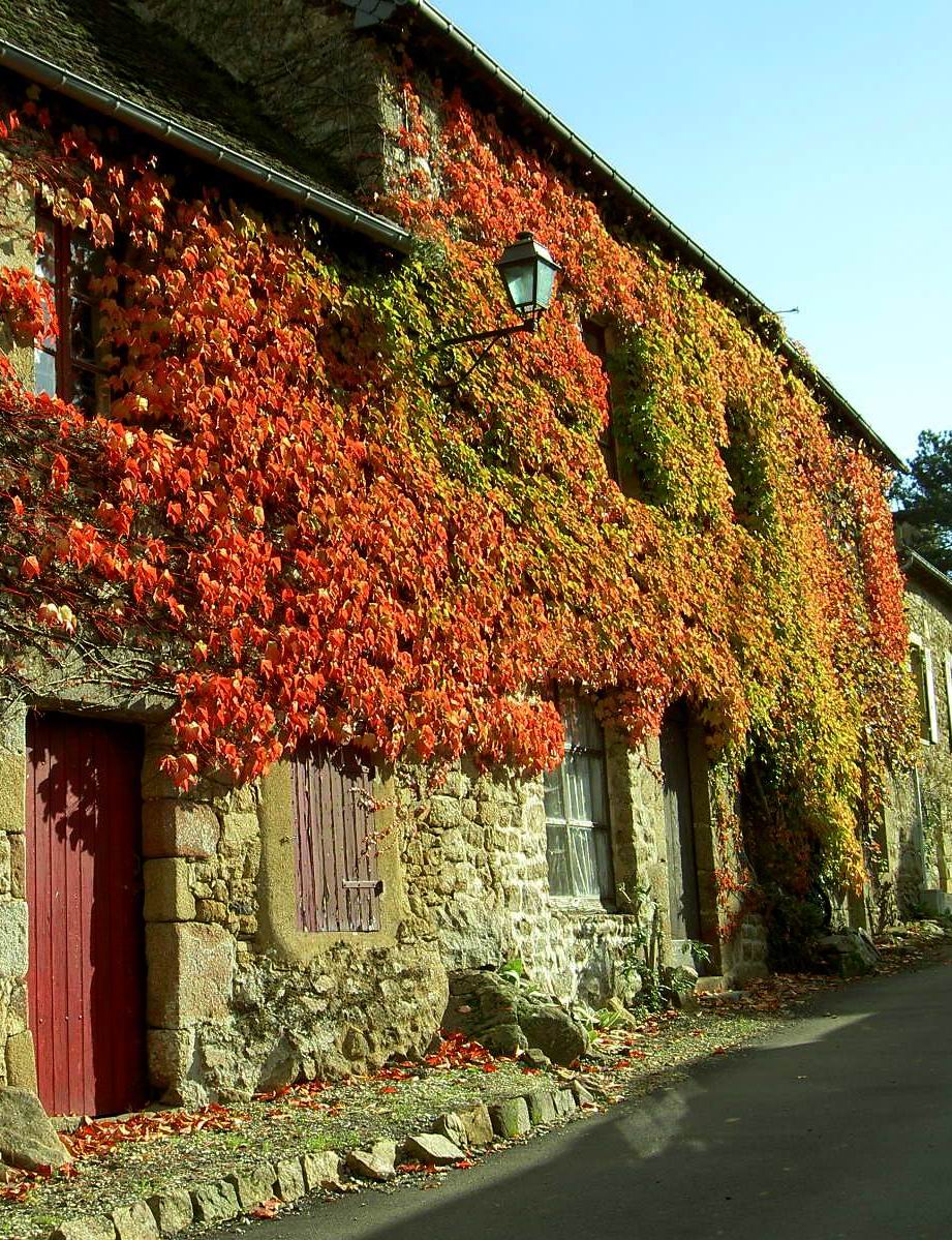 La vigne vierge est sans conteste le plus bel ornement de la maison, et un seul pied suffit à en habiller tous les murs en quelquesannées. Vert tendre au printemps, le feuillage fonce en été tout en isolant la maison de la chaleur. En automne ses différents ton de rouge, selon que les feuilles sont sur des pousses neuves ou jeunes, exposées à l'est ou au sud, créent un jardin vertical de toute beauté. Le seul inconvénient, c'est que les feuilles sont caduques et tombent en abondance dans les gouttières, obstruant les trous d'écoulements des eaux.