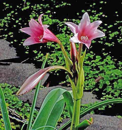 Adoptez également C. amabile, rose et rouge, C. asiaticum, à la hampe florale unique, portant jusqu'à 40 fleurs groupées en une grosse ombelle et C. bulbispermum, rose pâle veiné de pourpre au revers des tépales, que vous devrez installer dans l'eau durant toute la belle saison.