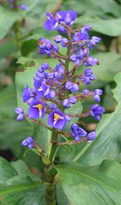 Dichorisandra thyrsiflora est une commélinacée, autrement dit une misère. Mais quelle allure ! Elle porte jusqu'à 2m de hauteur de grandes thyrses aux fleurs lapis-lazulli. Cette brésilienne rutilante fleurit en ce moment à l'ombre des grands arbres, mais il faut déjà songer à la rentrer en serre ou en véranda, ou sa floraison va durer deux mois encore.