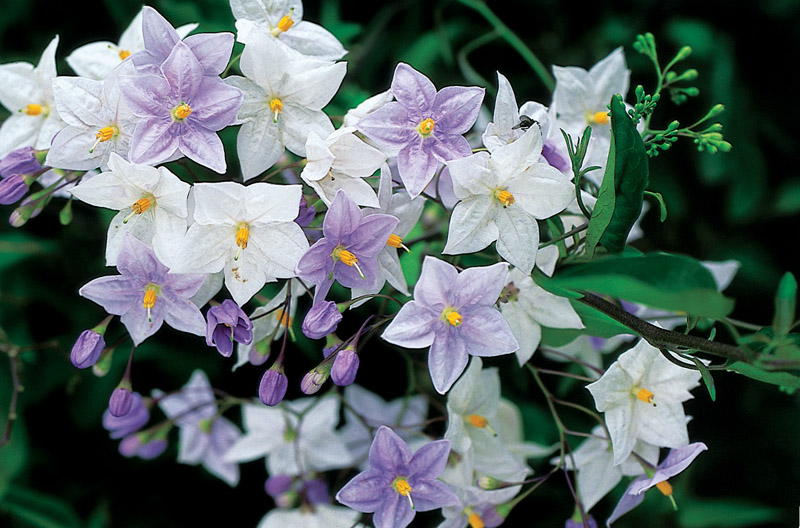 Si vous êtes toujours en quête de plantes florifères et agréables pour la mauvaise saison, sachez que la morelle à l'aspect de jasmin (Solanum jaminoïdes) en est une. Elle fleurit un peu toute l'année, mais beaucoup en automne. Ses fleurs sont réunies en grappes d'un blanc bleuté. Cette excellente plante de serre froide ou de véranda ne demande qu'un entretien limité pendant l'hiver. Gourmande en eau au printemps et en été, elle ne réclame qu'un arrosage très modéré pendant l'hiver. Vous pourrez la rempoter au printemps dans un terreau riche agrémenté d'un engrais à décomposition lente. Pour que sa croissance soit rapide, prévoyez-lui un pot de grande taille (30cm de diamètre).