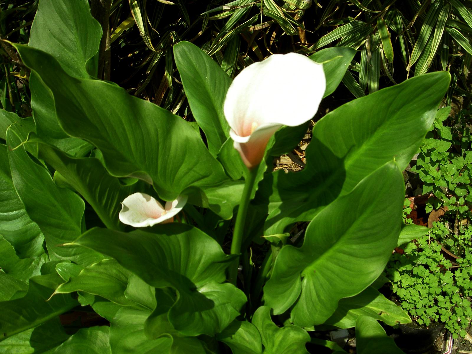 En fait, l'arum (Zantedeschia æthiopica) est toujours vert sous les climats doux. Seul le froid le met en repos, donc retarde sa floraison. Nous avons une serre, profitons-en !