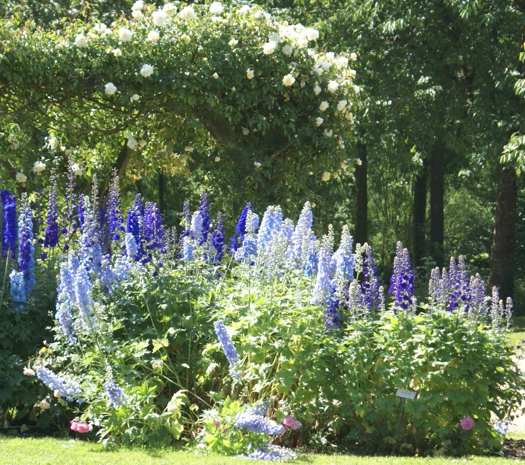 Un jardin secret constitué de simples (les médicinales), une allée des petits fruits, un camaïeu de verts, un orgue végétal de delphiniums, digitales, haricots grimpants sur des treillis, arroche..., un clos bleu ou rouge...