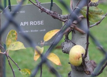 En réalité, elle se nomme 'Api Rose' (*). D'origine ancienne et incertaine, elle mûrit de janvier à mai. L'arbre est de faible vigueur, et il est préférable de le cultiver en forme basse ou en demi-tige.