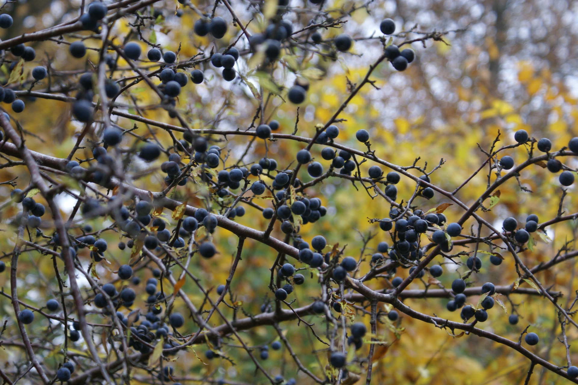 Le prunier épineux (Prunus spinosa) ou prunellier, aime les haies et les lisières forestières ; il pousse jusqu'à près de 1000m d'altitude. Il est à présent couvert de petites billes bleues, d'un goût âcres mais consommables dès lors qu'elles ont subies les premières gelées. Elles sont communément utilisées pour préparer la liqueur de prunelles, mais savez-vous que l'on peut en faire gelées et compotes. Essayez donc ce dessert peu commun : 300g de prunelles pour 80g de sucre, un verre d'eau, un verre de vin blanc, un zeste de citron, une pincée de cannelle et de sel, à laisser cuire jusqu'à obtention d'une compote qui, débarassée de ses noyaux, sera servie tiède et proposée avec un peu de crème fraîche...