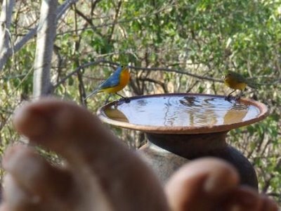 Offrez-leur un point d'eau fraîche que vous changerez chaque jour afin d'éviter le développement de bactéries et d'algues. Choisissez un joli bain d'oiseaux, une cuvette ou une soucoupe à bord plat. Disposez en son milieu une pierre propre affleurante sur laquelle les animaux pourront se poser. Enfin, reliez la pierre au bord du récipient par une pêtite baguette ou une planchette : vous éviterez ainsi les noyades.