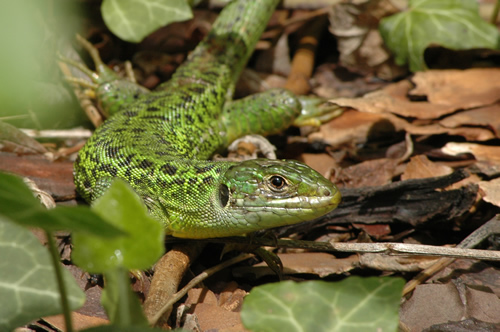 Le lézard vert, très vorace et le plus gros de la famille, peut se permettre d'attraper des gros criquets et même des petits rongeurs. Grand amateur de soleil et de chaleur, il n'est présent qu'au sud de la Seine. Il vit dans les champs, en lisière des haies ou des bois et adopte volontiers les jardins de bio.