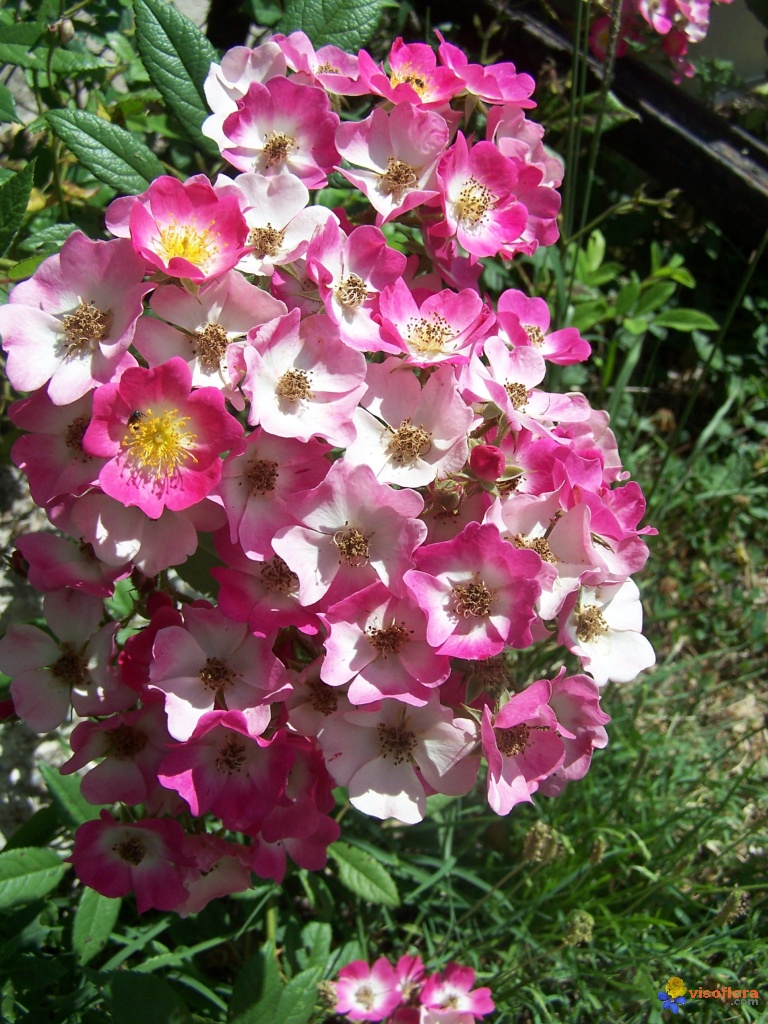 Séduits par ce vigoureux rosier qui, en une saison, a recouvert une clôture, nous l'avons, sans hésiter, installé en cinq exemplaires pour créer une transition naturelle entre le jardin et et le pré voisin. Chaque année, il explose en une multitude de fleurs rose vif qui nous enchantent de mai à octobre. Particulièrement adapté aux rudes climats montagnards, ce rosier accepte les expositions mi-ombragées et des sols de tous types. En situation extrême, il appréciera néanmoins un apport de bon compost et un paillage hivernal. En mars, nous raccourcissons ses longs rameaux épineux, idéaux pour créer un palissage ou une haie défensive. En ce mois de juillet, il joue sa partition avec brio dans le grand concert floral, mais c'est peut-être en novembre, une fois la féerie estivale envolée, que ses dernières fleurs vous touchetront le plus ; résistant jusqu'au bout, dernières sentinelles du jardin, elles sont soubvent l'ultime écho d'un concert terminé...