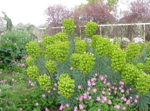 Les tiges florales des euphorbes arbustives et à feuillage persistant telles que E. characias et ses hybrides, E. myrsinites, E. robbiae, E. rigida... commencent à se dessécher. Ces tiges ne repoussent pas lorsqu'on les taille en dessous de l'inflorescence : aussi faut-il les couper au ras du sol, le renouvellement des euphorbes se faisant par les jeunes pousses qui partent de la base.