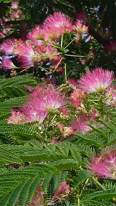 albizzia, néflier du Japon, palmiers et lauriers-roses.