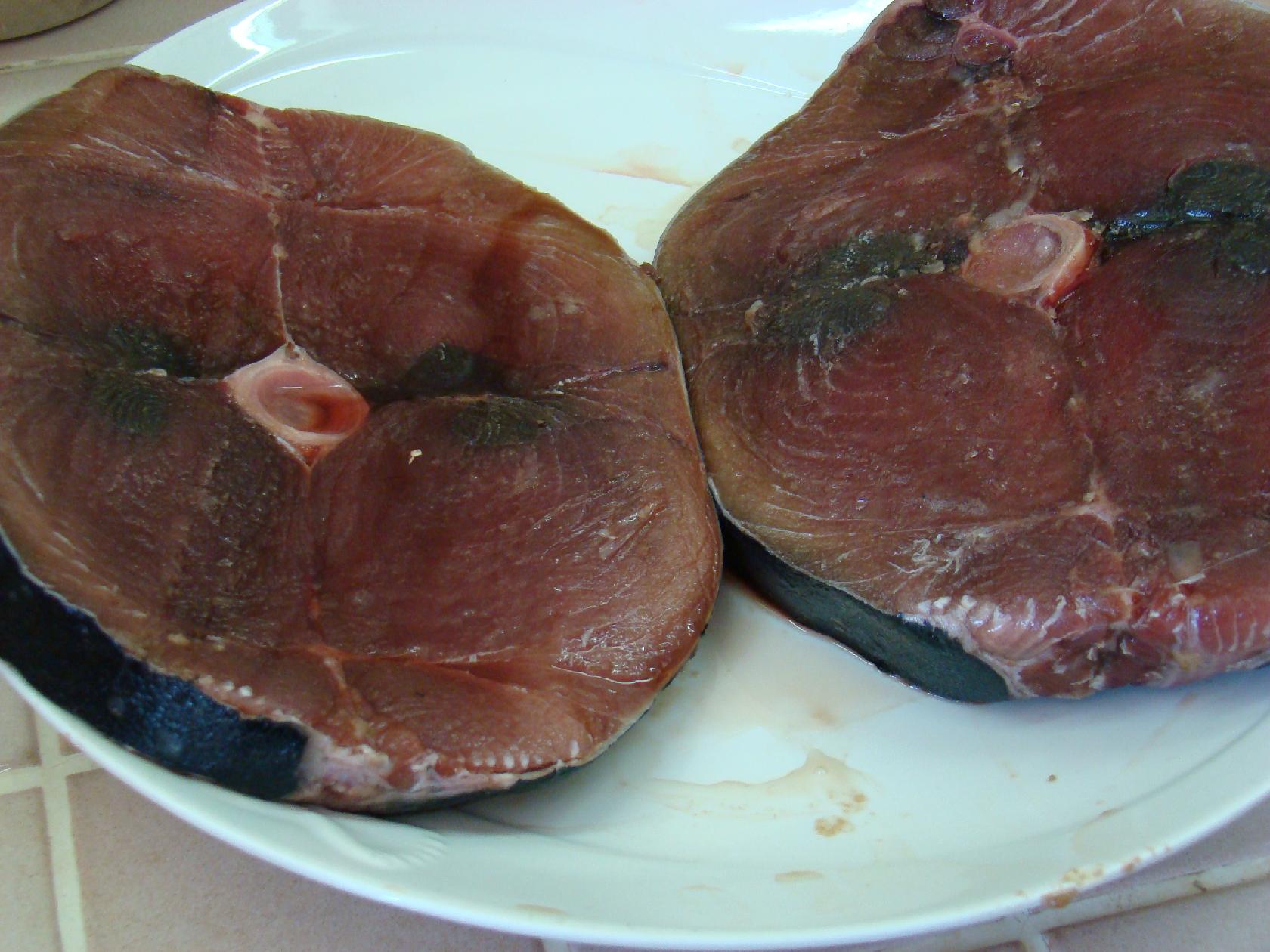Le thon, très gros, s'achète en tranches. Sa chair est blanche ou rouge. On peut le consom-mer cuit, en matelote (avec des tomates et arrosé de vin rouge et d'eau). Grillé, il a tendan-ce à se dessécher un peu ; préparez donc une sauce (oignons tomates, par exemple) pour l'accompagner. Prévoyez une tranche d'environ 800 g pour 4 personnes.