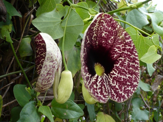Aristolochia littoralis (ou A.elegans) est une liane exotique dont les fleurs de 30 cm de longueur s'épanouissent d'avril à octobre. Elle prospère facilement sur le littoral, en situation abritée. En cas de gel, n'hésitez pas à la rabattre, elle fleurira rapidement sur les jeunes rameaux de l'année. Si vous pouvez récolter des graines, semez-les maintenant dans un mélange de tourbe, sable et terreau, au chaud. La germination a lieu au bout de 2 à 3 semaines. Transplantez les plantules en godets de 10 cm de profondeur avant de les mettre en places au printemps ou à l'automne, en terre riche et fraîche. Il est possible de les cultiver en appartement : elles nécessitent alors un rempotage annuel et beaucoup de lumière.
