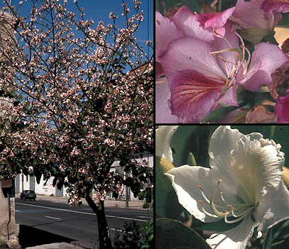 Les bauhinias ou 'arbres-orchidées" qui, à la magnificience de leur floraison exotique, ajoutent l'élégance des grandes feuilles cordiformes. Bauhinia blakeana est pourpre, et B. variegata, rose ou blanc (ses pétales rentrent dans la composition du thé au Népal). Ces petits arbres à tronc court sont à rechercher, car ils sont sans doute plus rustiques qu'on le suppose.