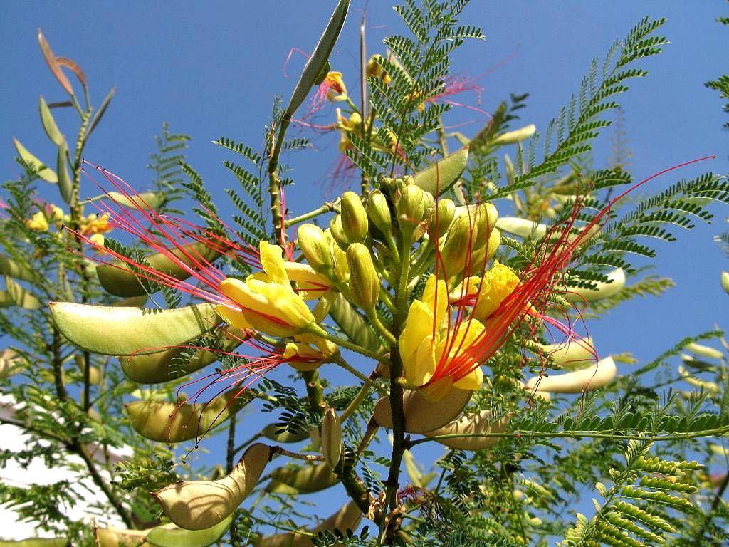 Les caesalpinias portent des fleurs aux pétales délicatement découpés, jaunes, orange ou rouges et aux longues étamines saillantes. Leur nom vernaculaire de p"petit flamboyant" évoque à merveille leur beauté. Ils viennent dans des sols les plus ingrats, et offrent une bonne résistance à la sécheresse.