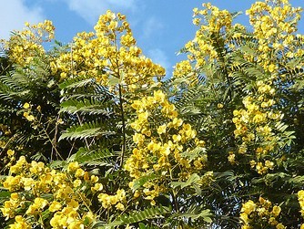 Elle apparaît en hiver chez Cassia spectabilis, en été chez C. didymobotrya (un peu fragile et C. corymbosa ; ce dernier se ressème abondamment : en conservant les plus beaux sujets, on obtient rapidement un joli sous-bois.