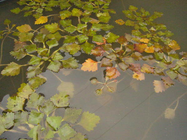 Très commune en Europe de l'Ouest, la châtaigne d'eau (Trapa natans) forme un tapis dense et coloré à la surface du bassin durant toute la belle saison. Ses feuilles, en forme de losange, sont réparties en couronne autour d'une tige qui maintient la plante au fond. Dès que toutes les feuilles sont sorties, la tige se décompose, libérant la plante. Des petites fleurs blanches apparaissent de juin à septembre, dressées au-dessus de l'eau. À l'automne, les fruits prennent une couleur noire qui rappelle la châtaigne. Comme elle, ils sont comestibles après cuisson. Autrefois, ils étaient récoltés sur les étangs sauvages. Sinon, ils tombent au fond pour former une nouvelle plante l'année suivante.