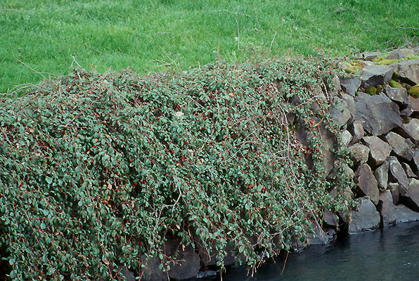 Au lieu des plantes aquatiques traditionnelles, pensez au Cotoneaster dammeri, couvre-sol dont les tiges s'étalent le long de la berge. Il possède des feuilles persistantesde 1,5 à 3cm de long, grossièrement ovales, vert moyen à vert foncé. Des fleurs blanches apparaissent en juin, laissant place à une multitude de petits fruits rouges en automne. Il ne dépasse pas 20cm de haut, mais peut recouvrir rapidement une surface de 2 à 3 m². Supportant parfaitement la taille, vous pourrez le contenir dans le volume souhaité. Vous pouvez aussi employer le Cotoneaster microphyllus, aux petites feuilles et au port un peu plus érigé.