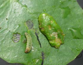 Parfois, les feuilles de nénuphar semblent avoir été broutées par un animal qui a pratiqué de larges incisions. Il n'en est rien ! C'est l'hydrocampe du nénuphar, un papillon qui a sévi. Ou plutôt sa chenille. Pour se protéger des prédateurs et pour aller d’une feuille à l’autre, celle-ci se construit un radeau avec deux fragments de feuilles collés l’un à l’autre. La taille de ces embarcations s’adapte à ses stades de croissance, d’où des découpes toujours plus importantes. Pour éviter ces dégâts, la seule solution consiste à récupérer les radeaux à l’épuisette. Encore faut-il les récupérer à temps … Quant aux adultes, ils sont au menu des grenouilles…