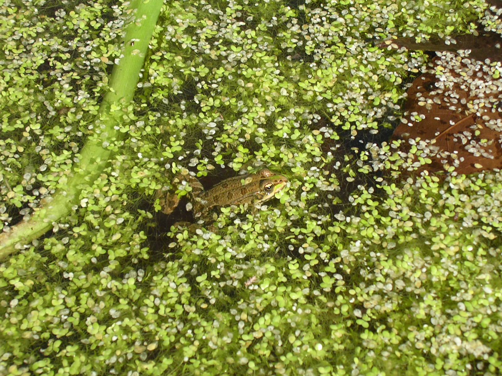 En fin d'été, les lentilles d'eau peuvent former un tapis végétal à la surface du bassin. Elles profitent de la chaleur emmagasinée par l'eau et des matières nutritives dissoutes.