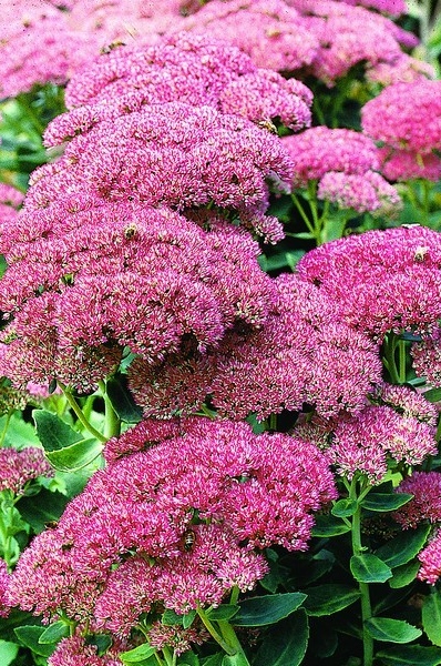 Les grands orpins (Sedum spectabilis) sont des vivaces aussi belles que faciles ! Dès le printemps, ils déploient leurs tiges aux feuilles bleutées, éclatantes de santé, de 40 à 50 cm de haut. La fin de l'été voit fleurir leurs inflorescences en plateau, passant du vert frais au rose pâle, puis au pourpre. Conservez-les tout l'hiver car même roussies, brunies par le froid, elles restent décoratives. Il en est aux fleurs plus rouges, d'autres blanches, mais le plus spectaculaire d'entre tous est 'Herbstfreude' ( ou 'Autumn Joy', on le trouve sous ces deux dénominations). Il porte bien son nom "joie de l'automne" car il allie à ses fleurs rouge brun la coloration jaune de ses feuilles. Certains arborent aussi un feuillage panaché comme 'Automn Charm' ou pourpré comme 'Matrona'.