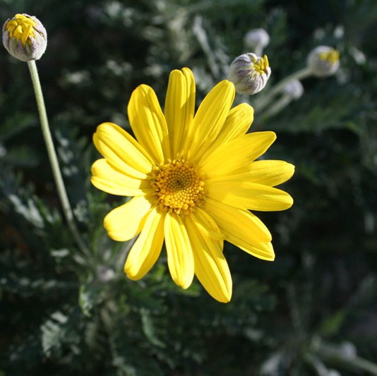 L'euryops pectiné, belle marguerite jaune d'or de la famille des Astéracées, originaire d'Afrique du Sud, fleurit de décembre à avril.