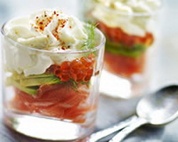 Détaillez les tranches de saumon fumé en fines lamelles et répartissez-les dans 12 petites verrines. Ajoutez ensuite les lamelles d'avocat et placez au frais le moins longtemps possible.