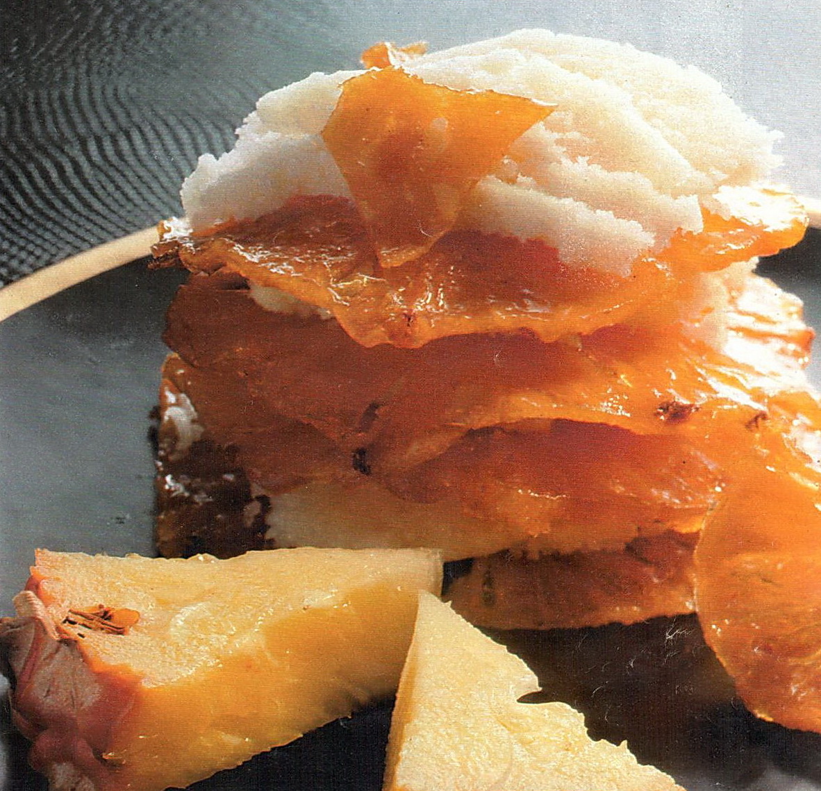 Pour servir, déposez une tranche d'ananas sur quatre assiettes à dessert. Posez une cuillerée de crème parfumée à la noix de coco au centre et continuez le montage des cristallines en terminant par une tranche d'ananas recouverte d'une bonne cuillerée de crème.