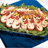 Fendez les trois langoustes restantes, dans le sens de la longueur. Décorez-les de mayonnaise à l’aide d’une poche à douille, puis avec six tomates cerises coupées en deux, et des rondelles d’olives noires.