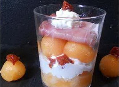 Ajoutez la chantilly au porto, disposez les tomates confites, les billes de melon et le jambon et servez aussitôt.