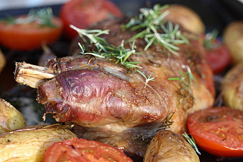 Servez l'épaule tranchée avec les pommes de terre et quelques moitiés de tomates mises 10 minutes avant la fin de cuisson !