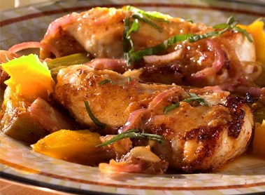 Lotte rôtie à la mangue sur nid de poireaux