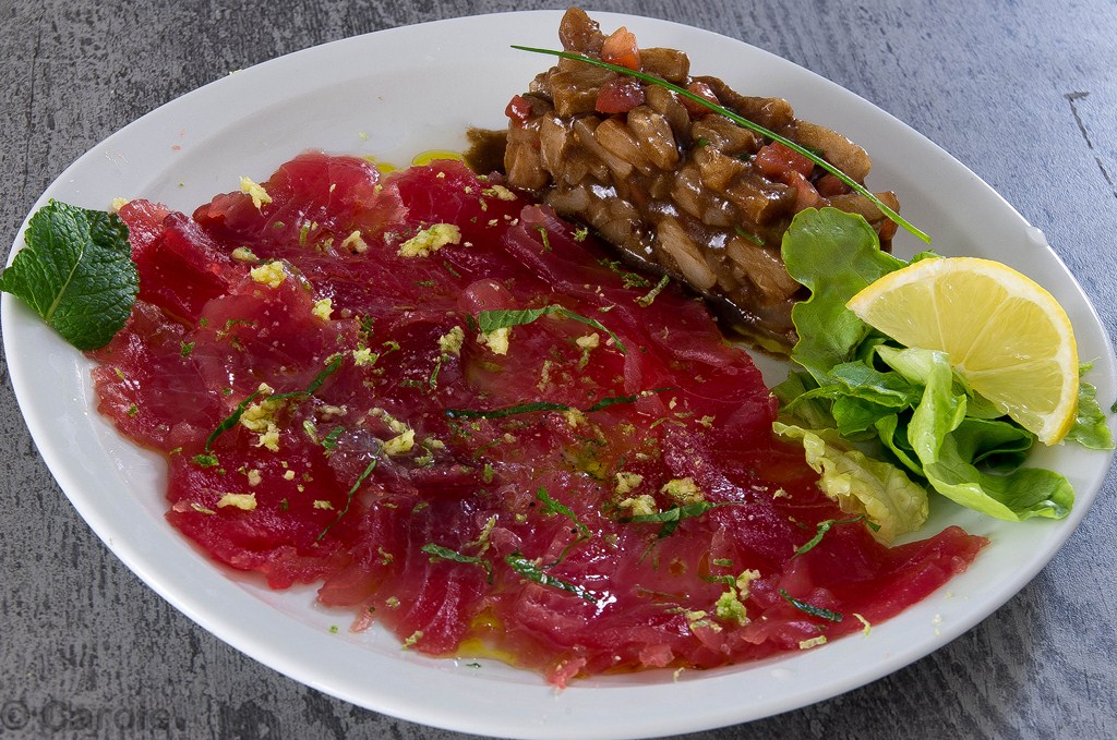 Coupez le thon le plus finement possible et tapissez-en 4 assiettes.