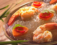 Remettez le bouillon dans la casserole et faites bouillir les crevettes, la carotte épluchée et en fines lamelles, et les pâtes.