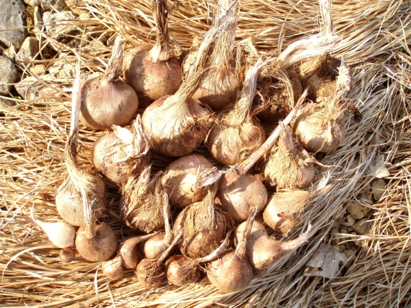 Après la mi-août, on peut récolter l'ail dans la plupart des régions. Laissez sécher les caïeux dans un endroit abrité de la pluie et du soleil mais aéré, sans les nettoyer. Au bout d'une semaine, vous pourrez enlever la terre sèche. Et si vous n'avez pas supprimé les tiges sèches, tressez-les avant de les suspendre.