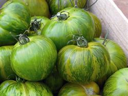 À maturité 'Green Zebra' est magnifique dans sa tenue verte émeraude plus ou moins rayée de jaune et de vert clair. Sa chair est verte également.