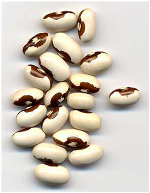 Le 'haricot à la Religieuse', aussi appelé 'Nombril de Bonne Sœur', 'saint Sacrement' ou 'Saint-Esprit à Œil Rouge' est un joli et délicieux (*) haricot dont les grains sont marqués, à l'ombilic, d'une tâche couleur lie-de-vin. C'est cette tache, qui rappelait aux uns la silhouette d'une colombe, aux autres celle d'un aigle, que lui viennent tous ces noms plus ou moins poétiques et sans doute les légendes qui s'y rapportent. Il s'agit d'une variété naine (40cm) très ancienne, produisant de longues gousses contenant 5 ou 6 grains chacune. Semez-le de la fin avril pour les régions les plus douces à la fin mai ailleurs, en poquets de 4 ou 5 grains, tous les 30cm sur le rang. Ils germeront en quelques jours. Buttez-les une première fois dès la levée et recommencez une semaine plus tard. Gardez ensuite la terre fraîche et meuble au pied jusqu'à la récolte, qui débute trois mois après le semis, lorsque les gousses jaunissent (grains frais) ou sèchent (grains secs à conserver au congélateur).