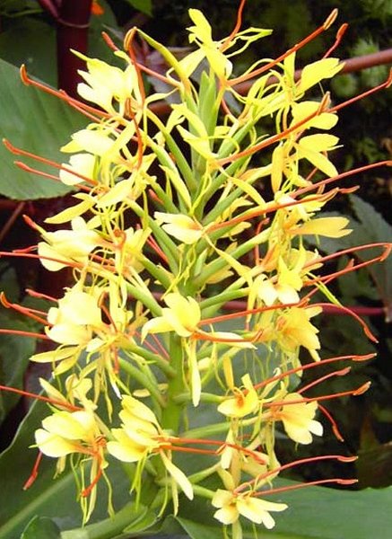 L'hédychium (Hedychium gardnerianum) nous vient des Indes orientales. Robuste et très florifère, il atteint 1-1,30m de haut. Sa floraison, qui commence à la fin du mois d'août, donne aux massifs du jardin, aux terrasses et aux balcons une ambiance exotique. Sa culture est facile si on lui a donné un bon terreau et assez d'espace pour qu'il développe ses puissantes racines. Il aime les sols fertiles et légers : offrez-lui un mélange à parts égales de bonne terre de jardin et de terre de bruyère, enrichi de compost. Un engrais à décomposition lente, à incorporer à la plantation, vous évitera la corvée de fertilisation pendant l'été. S'il est presque rustique dans le Midi, il est prudent de le rentrer dans la serre en hiver. Pour le cultiver, choisissez des pots d'un diamètre de 40cm minimum car il développe rapidement de nombreuses tiges qui forment de grosses touffes. Placez-le de préférence en plein soleil et assurez des arrosages réguliers et abondant pendant tout l'été.