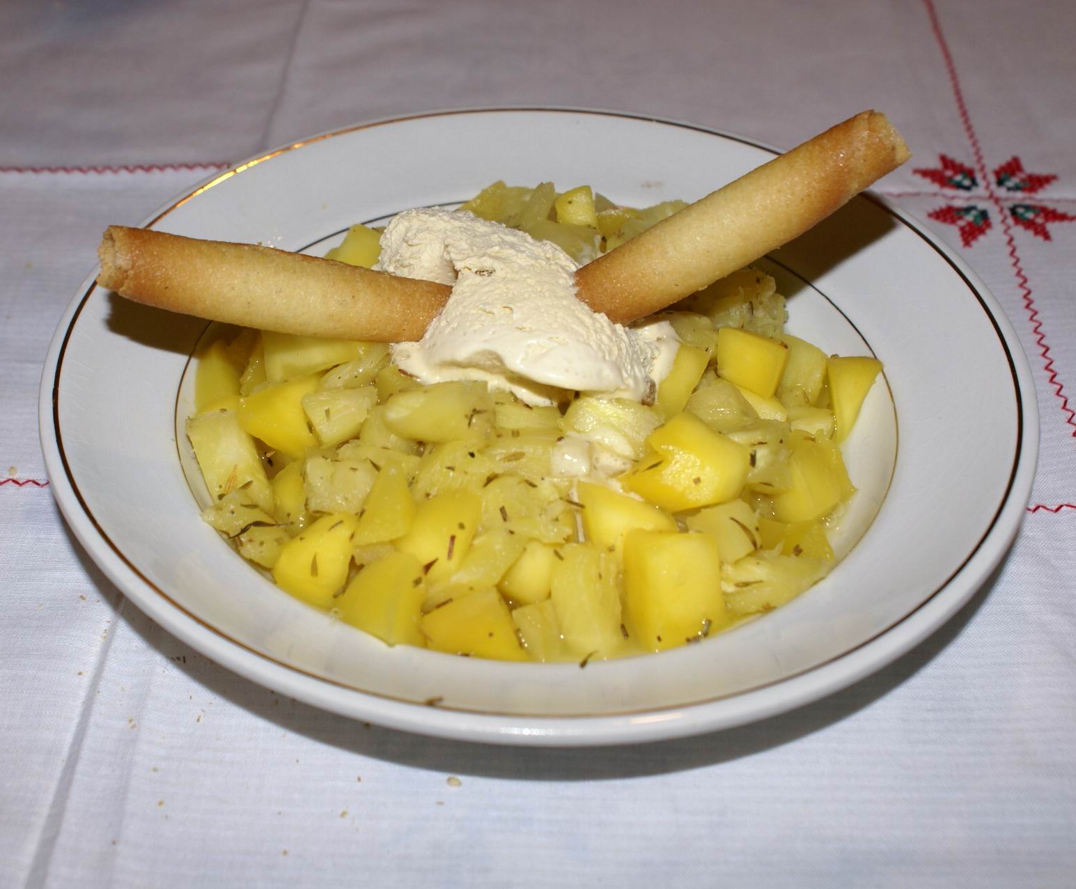 Placez dans un cercle l'ananas et la mangue, la quenelle de glace et les gaufrettes.