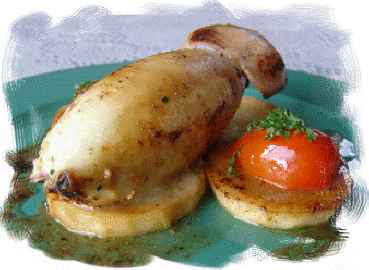 Dressez sur assiette les tranches de citron, posez-y les encornets, garnissez des tomates et un peu de persil haché, mouillez avec un peu de sauce de cuisson.