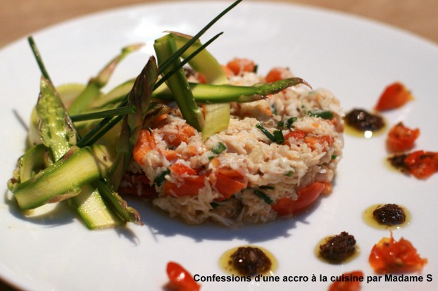 Dressez deux têtes par assiette avec 2 quartiers de tomate confite. Émulsionnez la sauce de corail et versez un cordon par assiette.