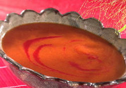 Dans une casserole, faites fondre, sans graisse, l'oignon avec quelques quartiers de tomate. Versez le bouillon de viande et ajoutez le reste de tomates. Faites cuire 25 mn puis mixez.